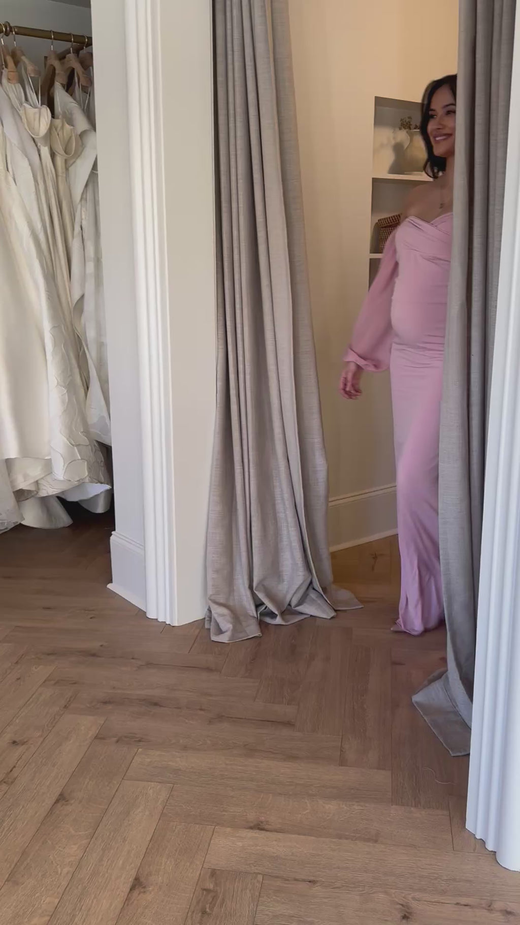 Custom designed for Bump City from talented seamstresses in Los Angeles, we bring you the Lulu gown. Designed to sculpt and flatter, this elegant maternity gown features a body-hugging fit with luxe stretch fabric and full double lining. The versatile off-shoulder neckline and long draped chiffon sleeves that add a romantic touch. Finished with a floor-length hem.